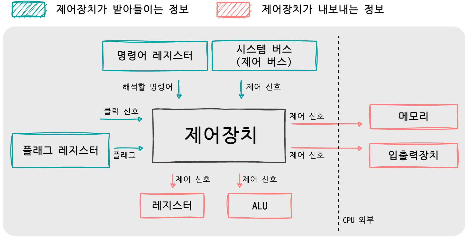- 제어장치: 제어 신호를 내보내고, 명령어를 해석하는 부품