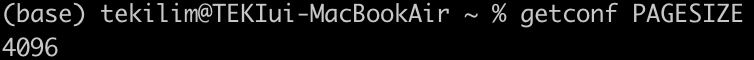 페이징은 외부 단편화 문제는 해결했지만 내부 단편화 문제가 생긴다. 내부 단편화 문제는 페이지 크기로 프로세스를 나눌 때, 페이지 크기보다 작은 크기로 메모리가 단편화되어 남는 현상을 말한다. 유닉스 기반의 OS에서는 아래와 같이 getconf 명령어로 페이지 크기를 확인할 수 있다.