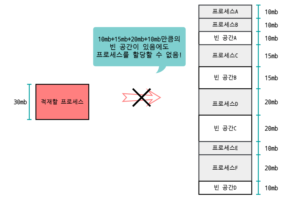 외부 단편화 문제란 여러 프로세스를 할당할 충분한 공간이 메모리 안에 남아있음에도 공간이 단편화되어 흩어져있어서 프로세스를 할당하지 못하는 문제를 말한다.