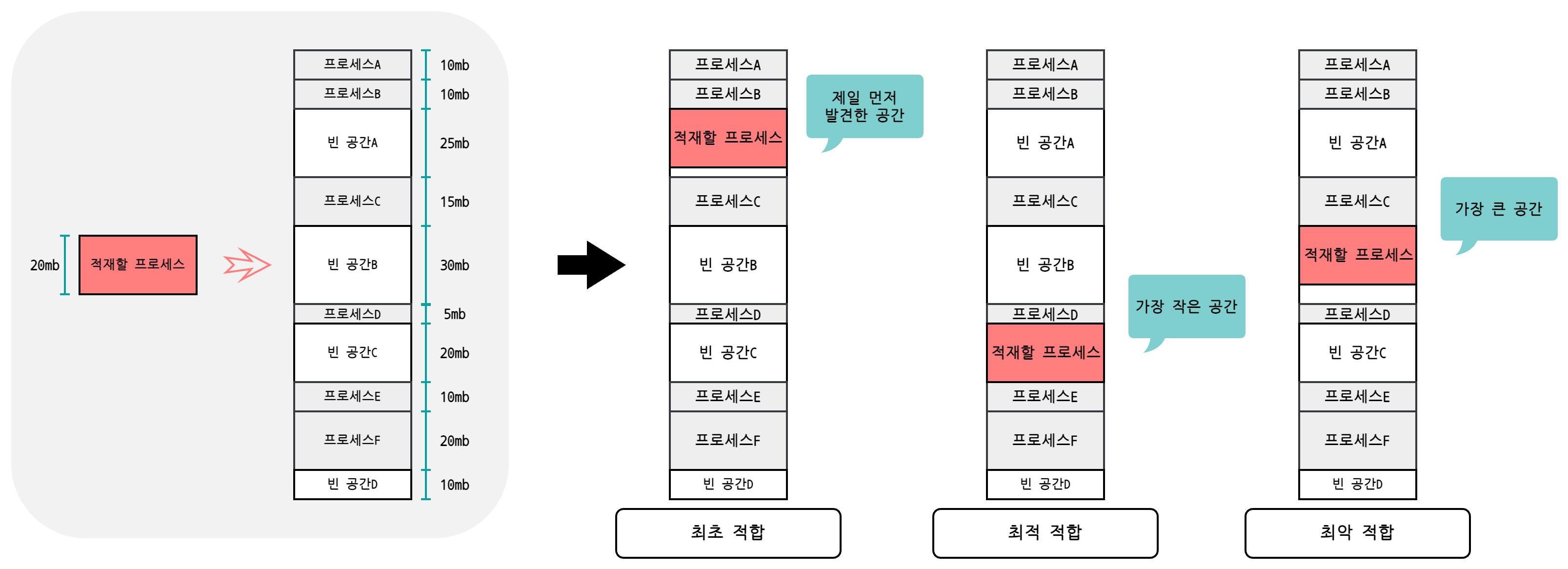 - 메모리 할당 방식 3가지: 최초 적합, 최적 적합, 최악 적합