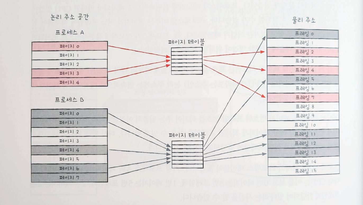 그런데 이렇게 하면 프로세스가 다음에 실행할 명령어 위치(다음 페이지 위치)를 알기 어려워진다. 그러므로 메모리 안에서 물리적 위치는 순서대로가 아니더라도 논리적 주소는 순서대로 배치될 수 있도록 페이지 테이블을 사용한다. 페이지 테이블은 페이지 번호와 프레임 번호를 짝지어주는 일종의 이정표로, CPU가 페이지 번호만 보고 해당 페이지가 적재된 프레임을 찾을 수 있게 되어있다.