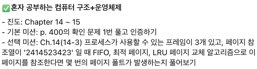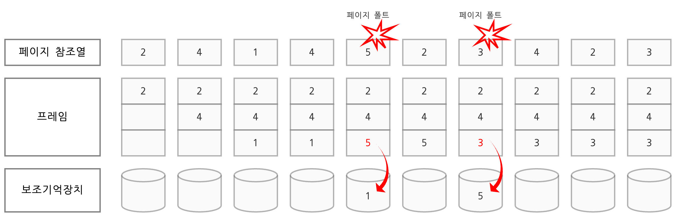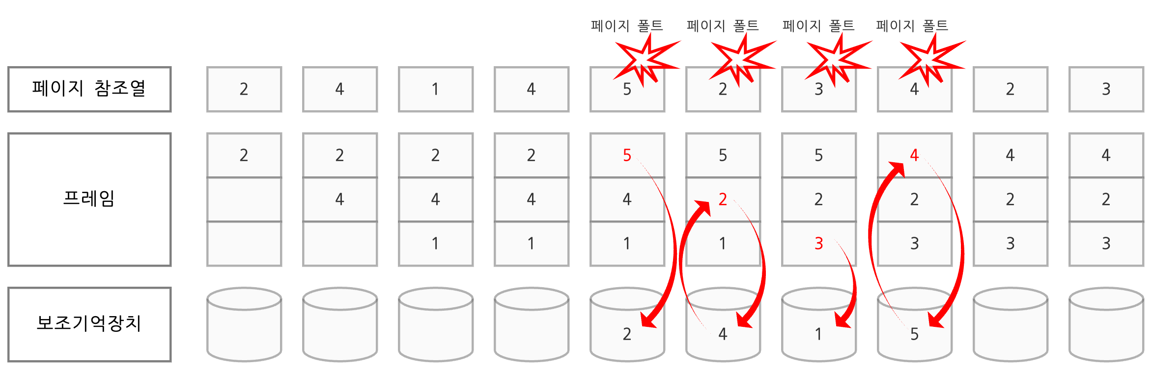 [미션 2] Ch. 14(14-3) 프로세스가 사용할 수 있는 프레임이 3개 있고, 페이지 참조열이 '2414523423'일 때 FIFO, 최적 페이지, LRU 페이지 교체 알고리즘으로 이 페이지를 참조한다면 몇 번의 페이지 폴트가 발생하는지 풀어보기