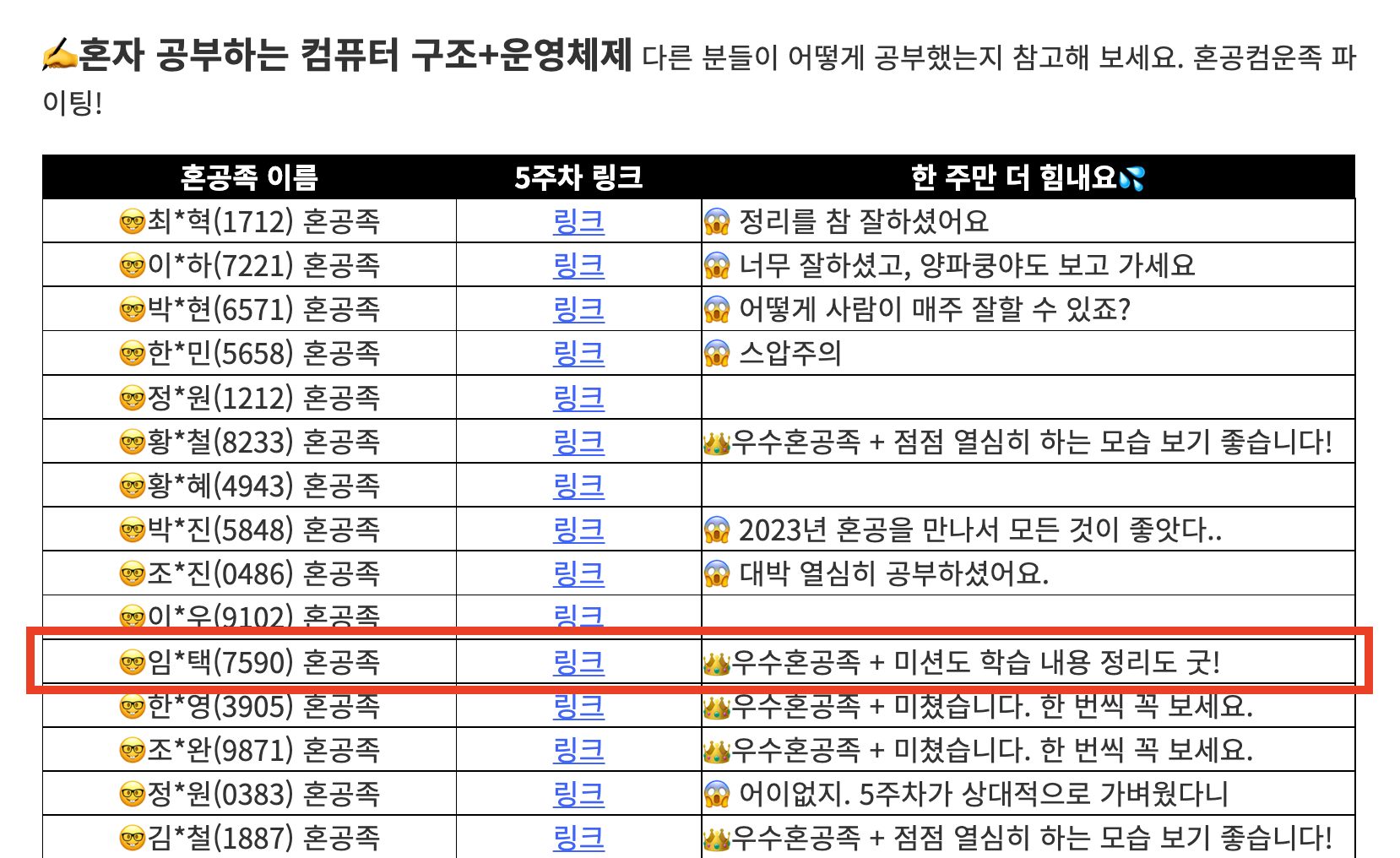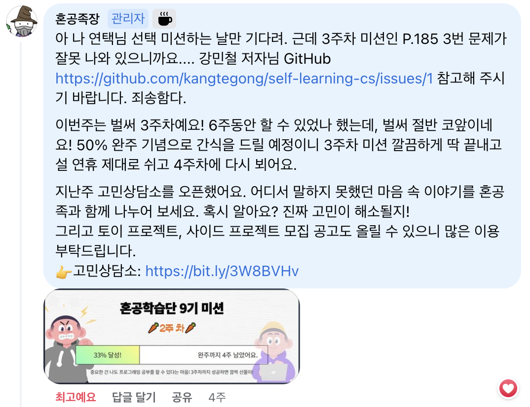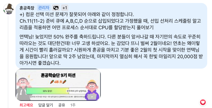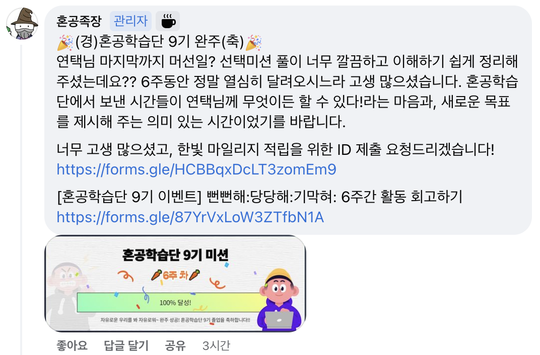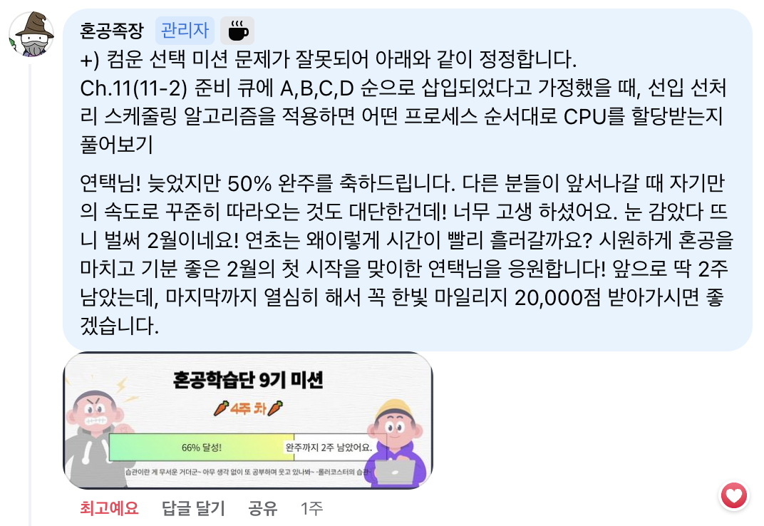사실 포기하지 않고 끝까지 공부할 수 있었던 데에는 혼공족장님의 따뜻한 응원이 있었다. (혼공족장님 감사해요♥)
