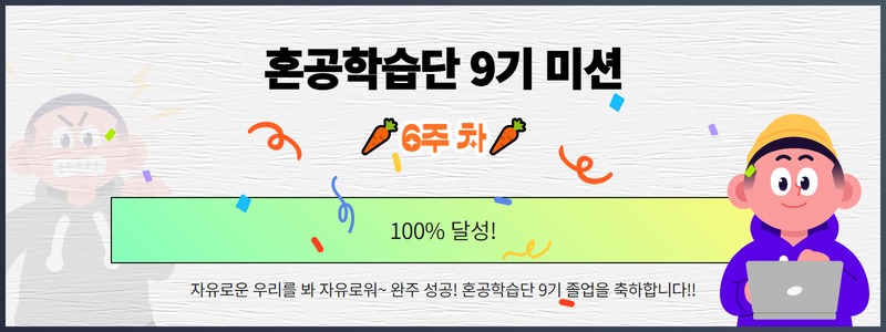 새해를 시작하면서 공부하는 습관을 들이고자 혼공학습단 9기에 도전했었다. 일을 하면서 6주 만에 책 한 권을 공부하는 건 쉬운 일은 아니지만 새해 버프를 받았는지 무조건 완주할 거라는 자신감이 있었던 것 같다.