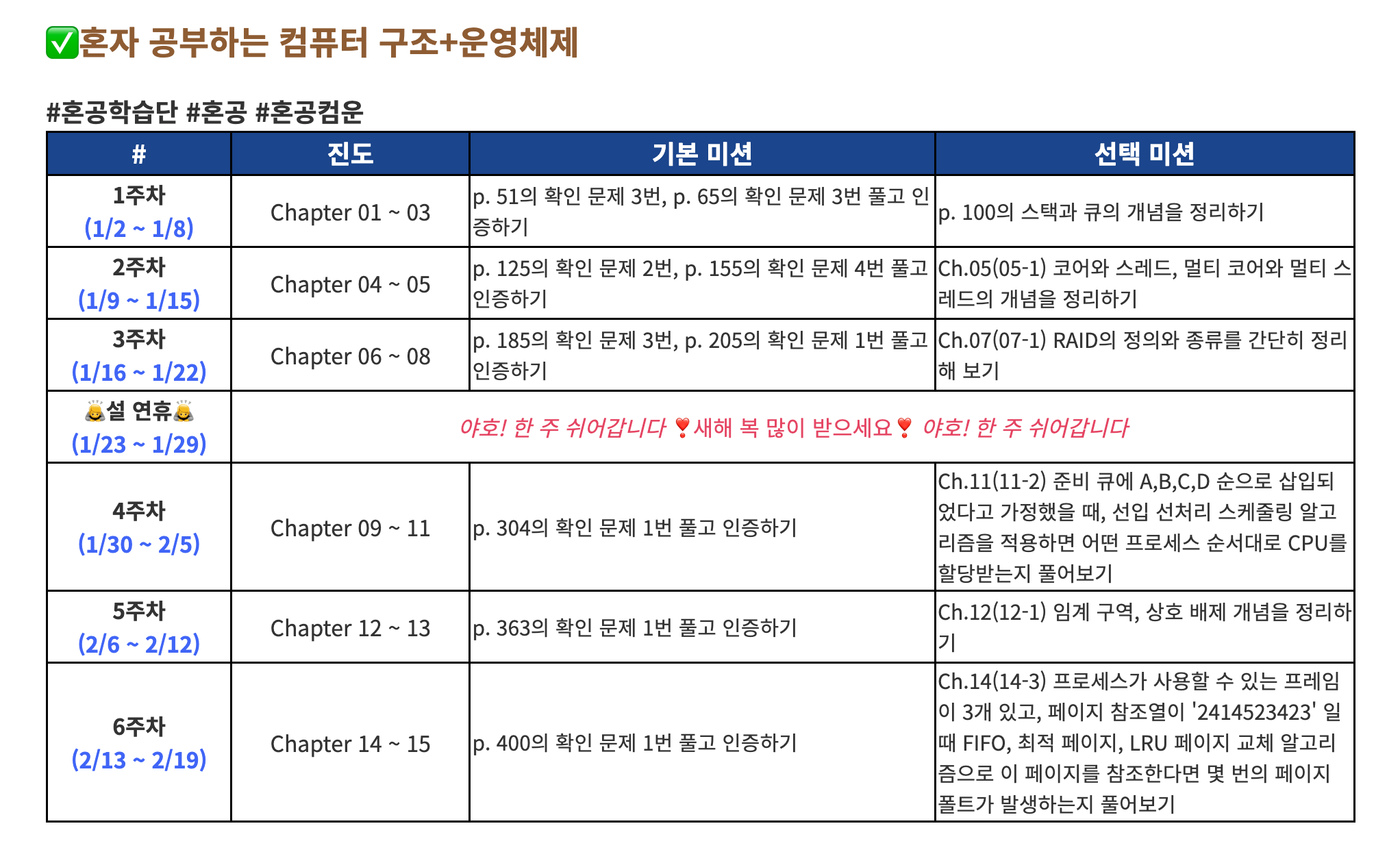 스터디 교재는 「혼자 공부하는 컴퓨터구조+운영체제」로 선택했고, 1월 2일부터 2월 19일까지 7주간의 여정이었다(쉬는 주 한 주 포함). 스터디 완주 조건은 매주 공부한 내용과 혼공족장님이 내주시는 문제 풀이를 정리해서 블로그에 올린 다음, 혼공족 페이스북에 공유하는 것까지다.