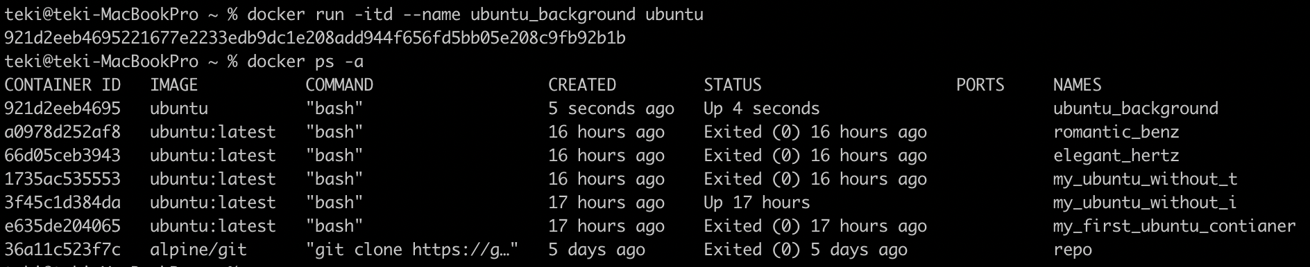 이렇게 만들면 이상한 문자열이 출력되고, 컨테이너 목록을 확인해보면 새로 생성한 ubuntu_background 컨테이너가 잘 떠있다. 이 문자열의 정체가 뭔지는 다음에 확인해봐야겠다. 아래에는 이전 실습에서 옵션을 하나씩 빼고 생성했던 컨테이너들이 보인다. i 옵션을 빼고 만들었던 컨테이너(my_ubuntu_without_i)는 command line 입력이 불가능했기 때문에 exit 명령어로 컨테이너를 종료하지 못했었다. 그래서 컨테이너 목록에서 보이는 것처럼 아직도 실행 중이다.