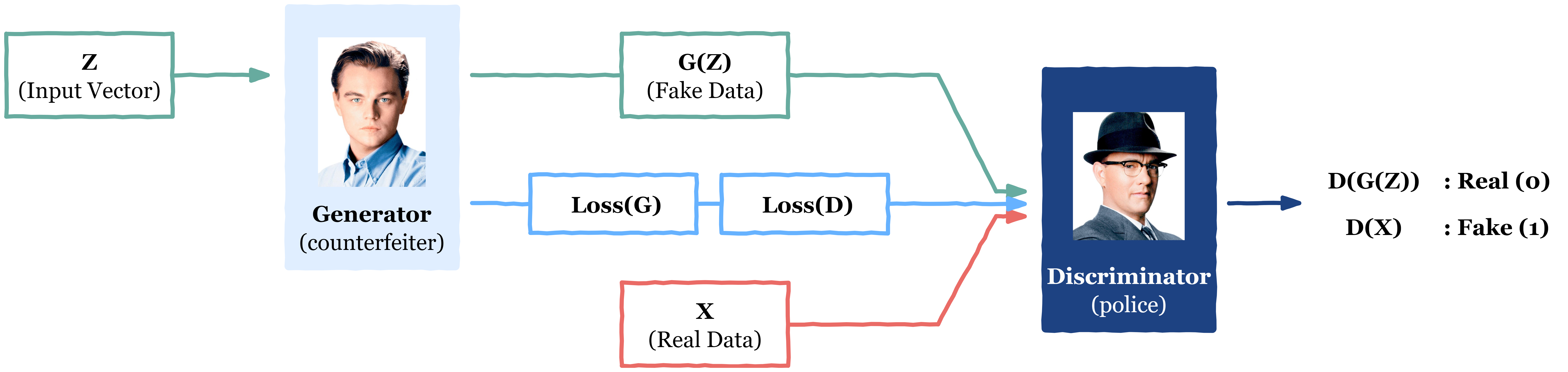GAN 모델을 처음 제안한 Ian Goodfellow는 이 모델의 원리를 화폐 위조범과 경찰 비유를 들어 설명했다. 경찰은 화폐 중에서 위조 화폐를 찾아내려고 한다. 경찰에게 적발되지 않기 위해서 범인은 더 진짜 같은 위조 화폐를 만들기 위해 노력한다. 이때, 범인이 만들어내려고 하는 가장 완벽한 위조 화폐는 경찰이 진위를 맞힐 확률이 반, 틀릴 확률이 반이 된다는 것이 GAN의 기본 아이디어이다. Ian G. 의 설명을 듣다 보니 영화 <Catch Me If You Can>이 생각난다. 그래서 디카프리오와 톰 행크스를 넣은 GAN 모델을 그려보았다.