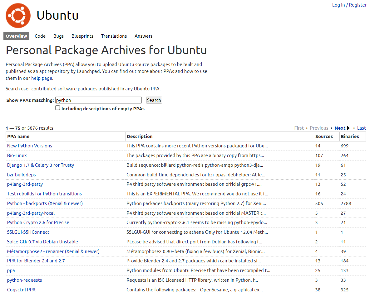 PPA(Personal Package Archive)를 통해서 Python3.6을 받아보자. PPA는 개인이 소스코드를 업로드하면 다른 사용자들이 우분투 환경에서 설치 가능한 오픈소스 패키지형태로 제공해주는 저장소이다. Ubuntu Launchpad에서 원하는 PPA를 검색할 수 있다. python3.6으로 검색했더니 결과가 만족스럽지 않았다. python으로 다시 검색해서 New Python Versions PPA를 사용하기로 했다.