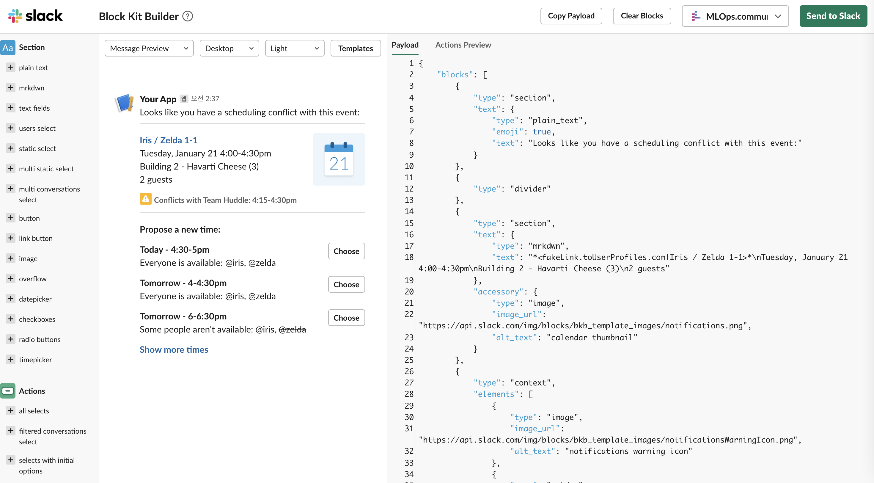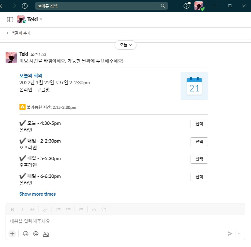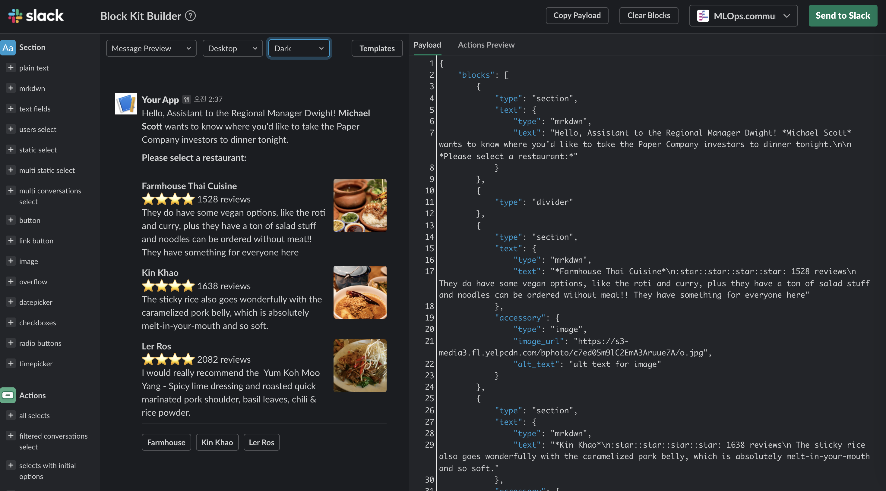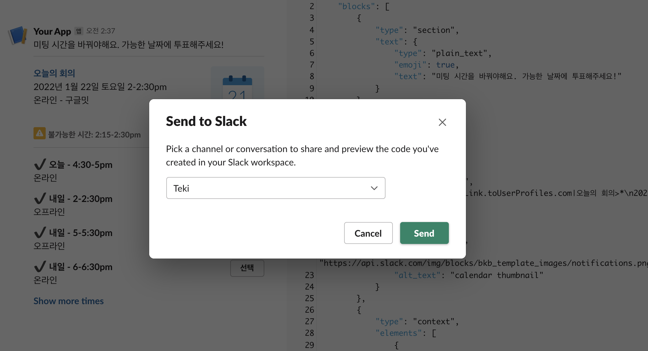 그리고 이 메시지를 슬랙으로 보내보았다. 슬랙에 보낼 땐 오른쪽 위에 있는 Send to Slack 버튼을 누르고, 보낼 채널을 선택하면 된다. 슬랙 워크스페이스 설정에 따라서 메시지를 보낼 수 있는 채널과 보낼 수 없는 채널이 있는 것 같았다.