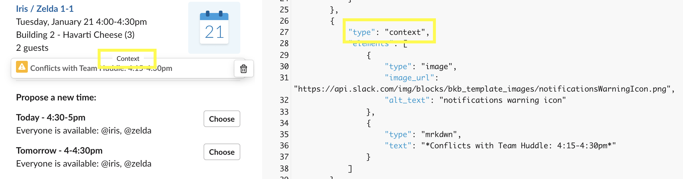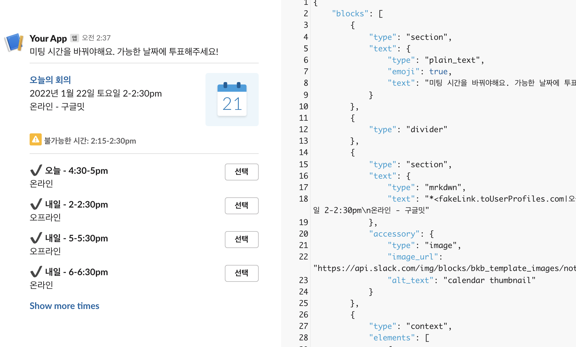 슬랙 봇으로 메시지를 보내려면 이 JSON을 복사해서 사용하면 된다.