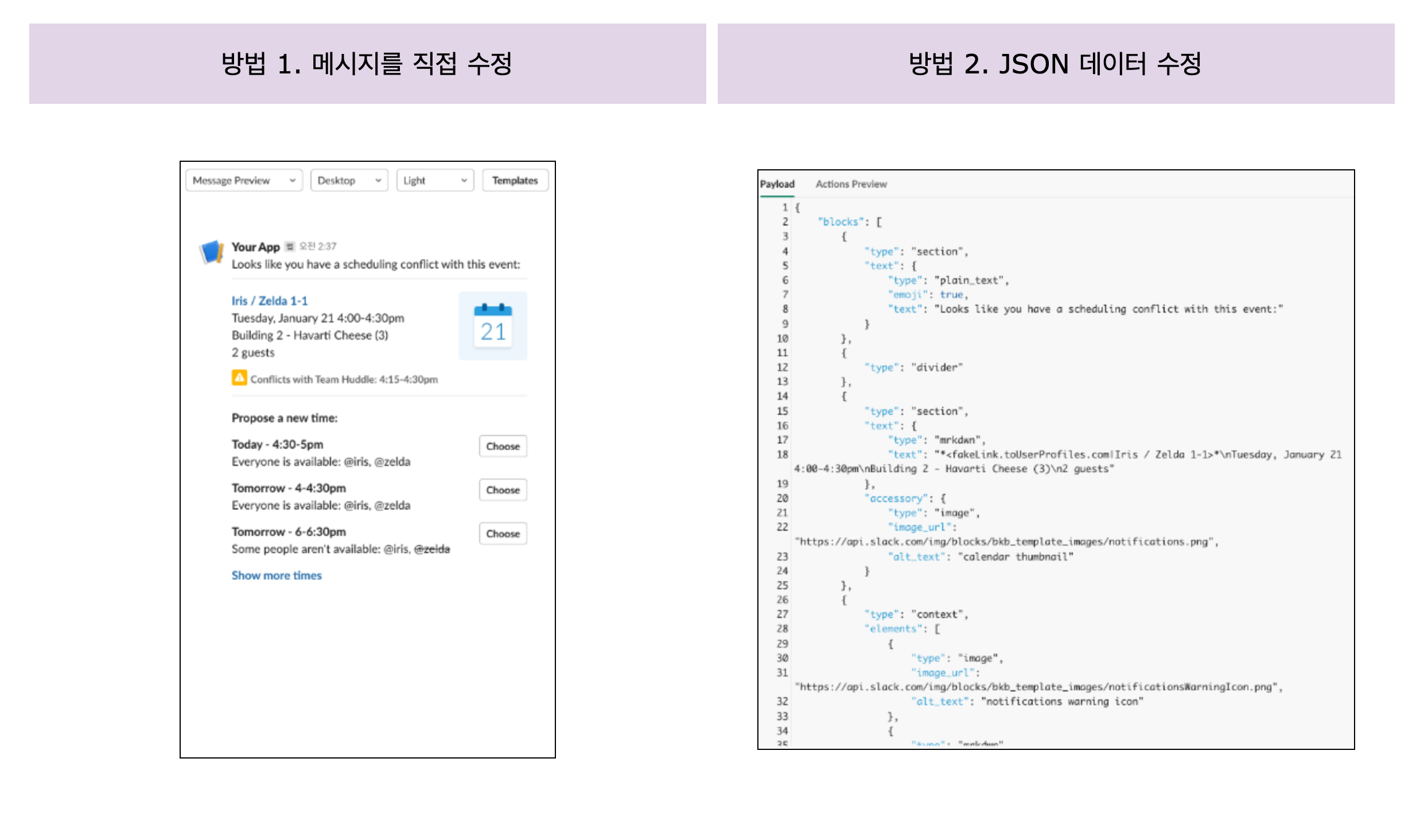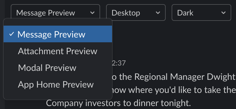 공식 문서에는 'surface'라는 Slack 애플리케이션이 보여지는 일종의 캔버스와 같은 것이라고 설명하고 있는데, 이 surface의 종류에 따라 메시지가 어떻게 보이는지 미리 보여주는 것이 목적이다. (정확하게 말하면 surface별로 preview를 제공하는 것은 아니다).