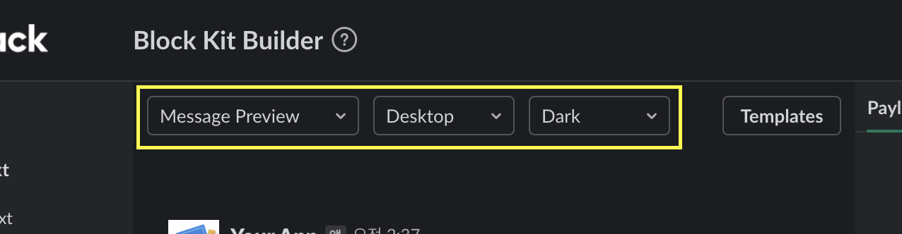 여기는 슬랙 메시지가 보이는 환경을 설정해서 실제로 메시지가 어떻게 보여질 지 미리 보여주는 곳이다. 가장 왼쪽은 Message Preview, Attachment Preview, Model Preview, App Home Preview 이렇게 총 4개의 Preview를 선택할 수 있다. Preview는 말 그대로 미리보기를 말한다. 즉, 무언가 네 가지 종류에 대해 미리보기를 할 수 있다는 뜻이다. 그런데 무엇을 미리 보여준다는걸까?