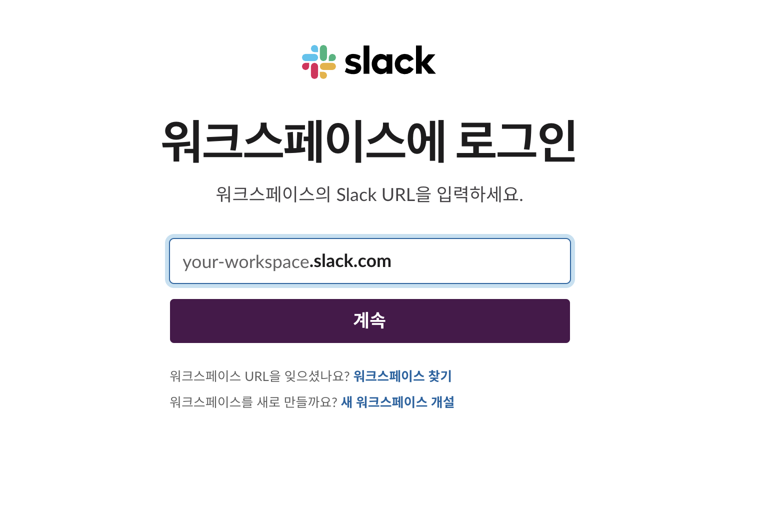 이 작업의 핵심은 Block Kit Builder라는 툴이다. 설치는 필요없지만 이 사이트를 처음 들어가면 아래처럼 워크스페이스에 로그인을 하라고 나온다.