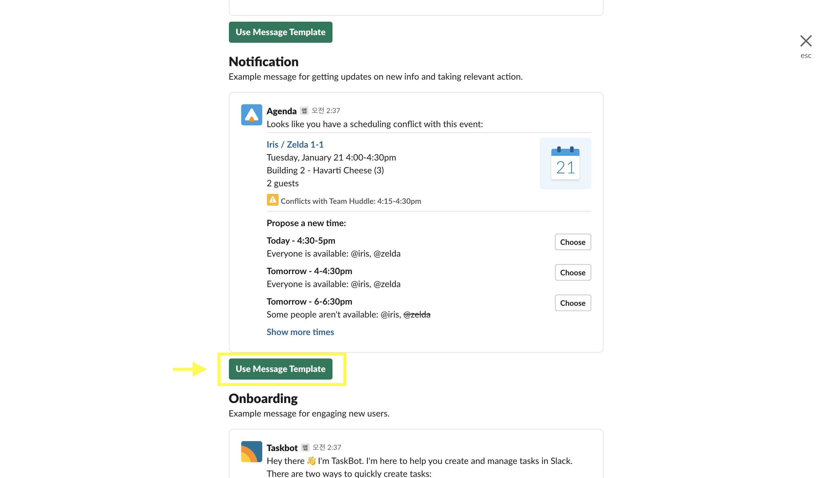 슬랙 환경 설정 버튼 옆에는 Templates라고 쓰여진 버튼이 보인다. 이 버튼을 누르면 바로 쓸 수 있는 메시지 템플릿들을 보여준다. 스크롤을 내려서 템플릿들을 확인해보고, Use Message Template 버튼을 누르면 바로 사용할 수 있다.