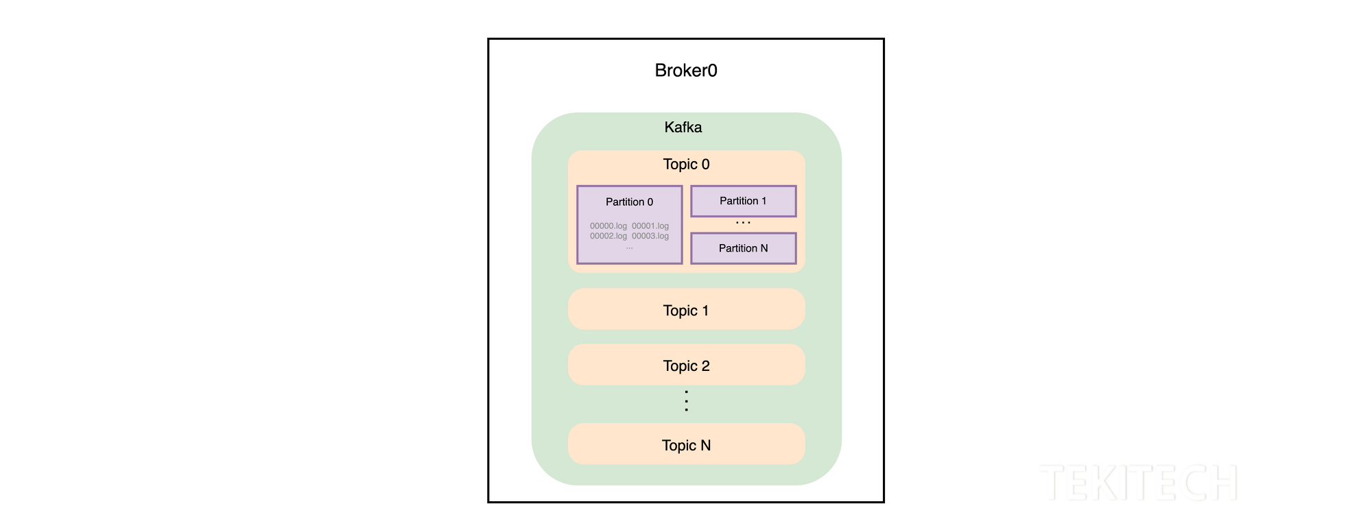 마지막으로 파티션 내부에 저장되는 메시지의 실체인 세그먼트가 있다. 세그먼트는 어떤 물리적 또는 논리적 공간이 아니라 로컬디스크에 log 파일 형태로 저장된 실제 메시지 데이터를 말한다. 구조를 표현한 그림에서 00000.log, 00001.log 등으로 적어놓은 파일들이 세그먼트를 의미한다.