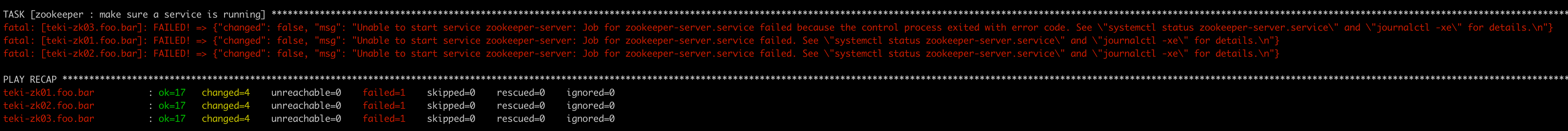 teki-zk02.foo.bar : ok=17 changed=4 unreachable=0 failed=1 skipped=0 rescued=0 ignored=0