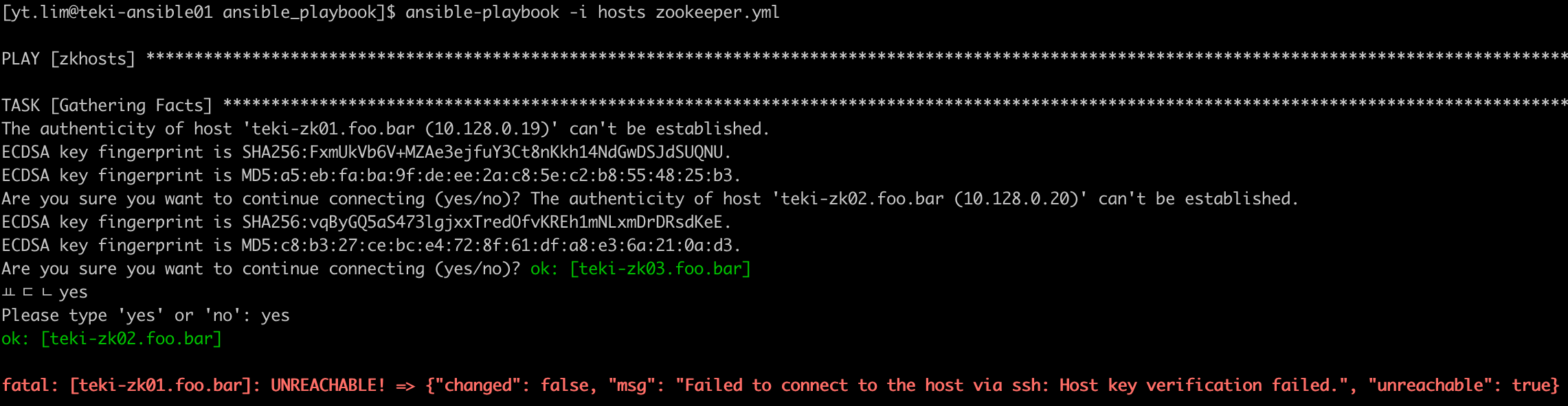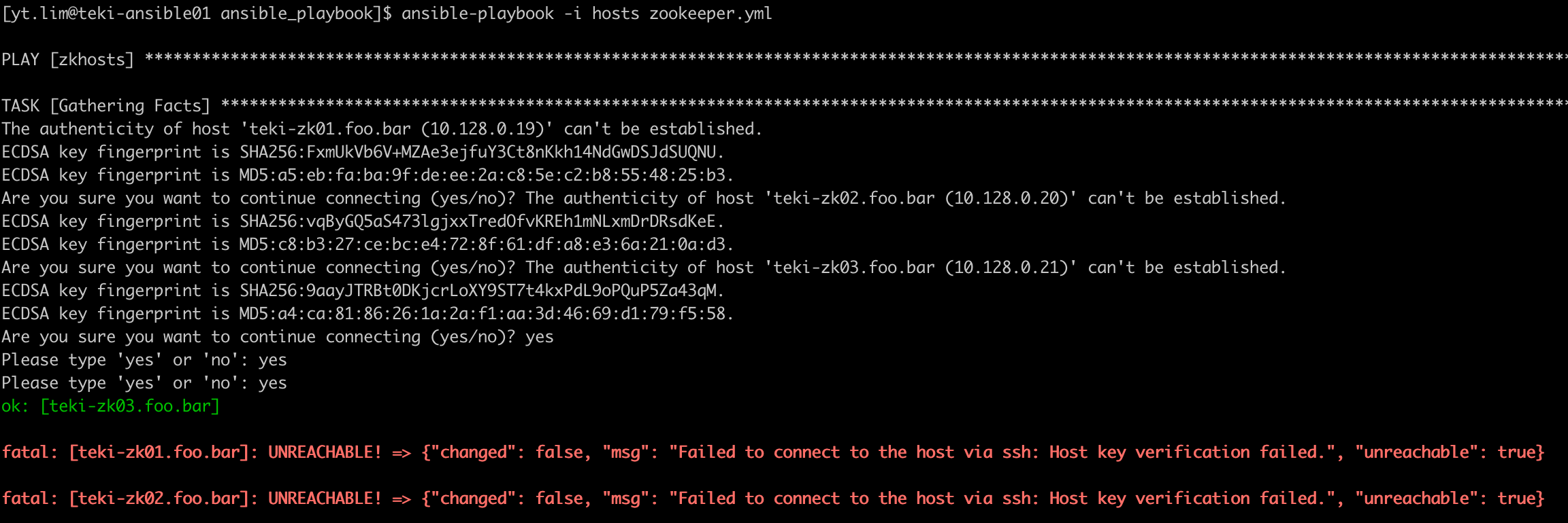 Are you sure you want to continue connecting (yes/no)? The authenticity of host 'teki-zk03.foo.bar (10.128.0.21)' can't be established.