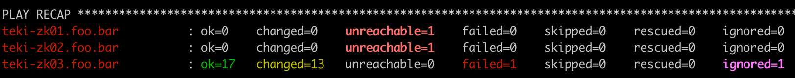 teki-zk03.foo.bar : ok=17 changed=4 unreachable=0 failed=1 skipped=0 rescued=0 ignored=0