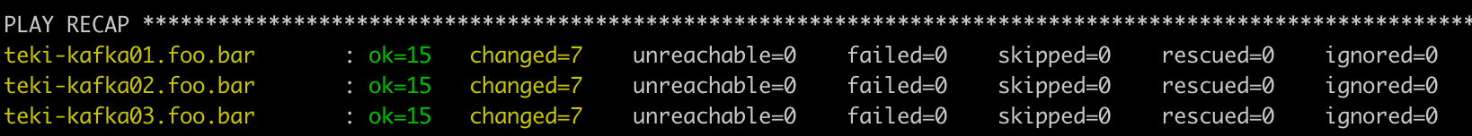 teki-kafka01.foo.bar : ok=15 changed=10 unreachable=0 failed=0 skipped=0 rescued=0 ignored=1