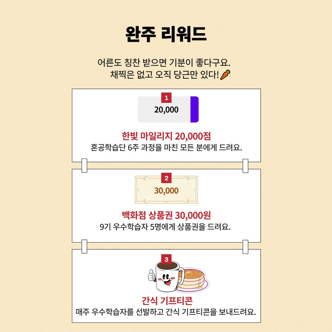 리워드도 있다. 책 한 권이 2~3만 원 정도인데 6주 과정을 마치면 한빛미디어의 도서를 구매할 수 있는 마일리지 20,000점을 주고, 그 외에도 상품이 있다. 9기 혼공족이 370여 명이라고 하는데 상품.. 받을 수 있을까?