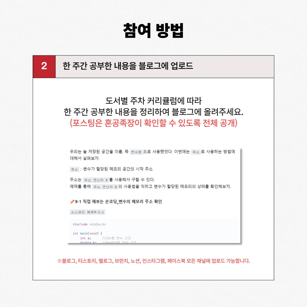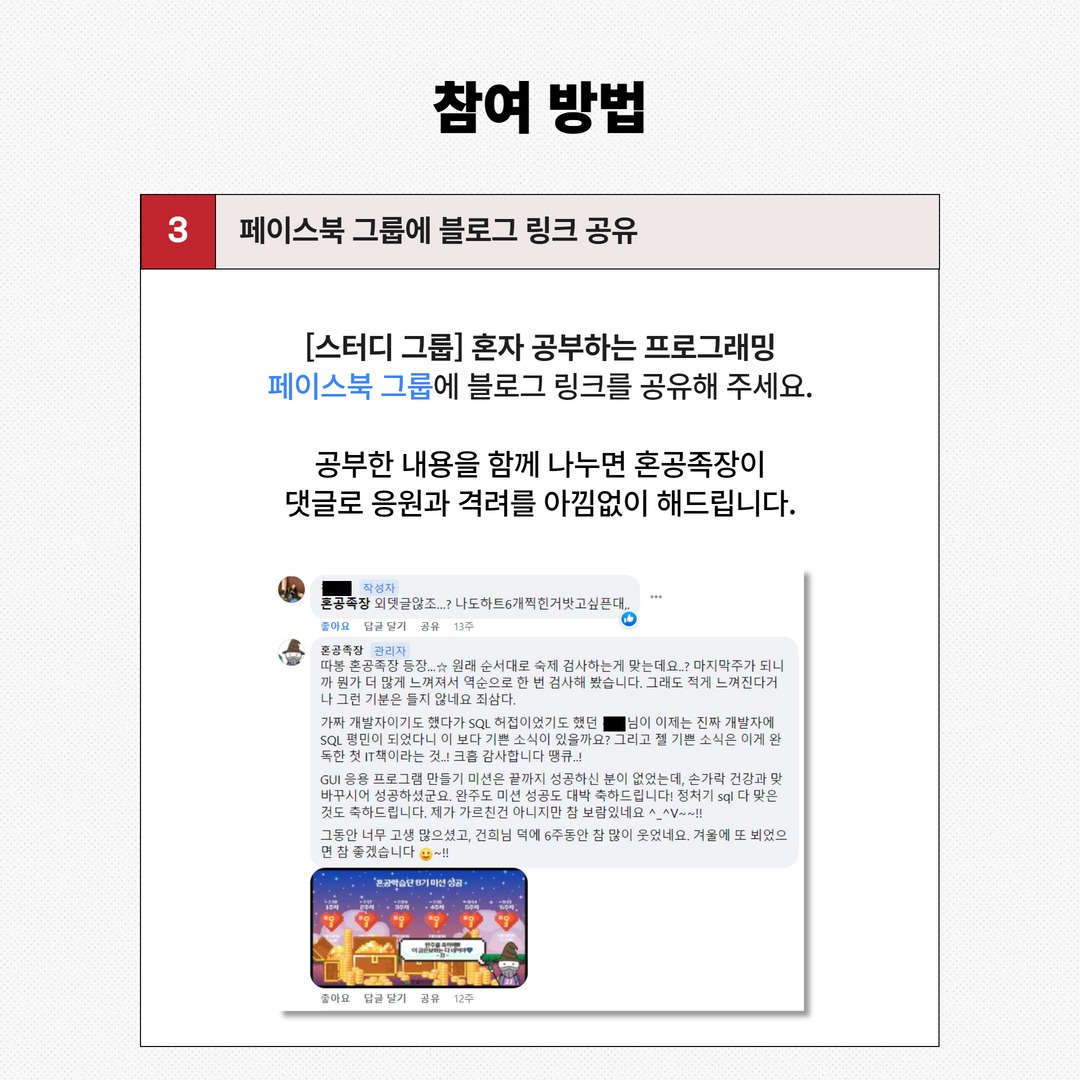 매주 정해진 커리큘럼을 일주일간 공부한 후, 블로그에 정리한 내용을 올려준 다음 페이스북 그룹에 공유해주면 된다.